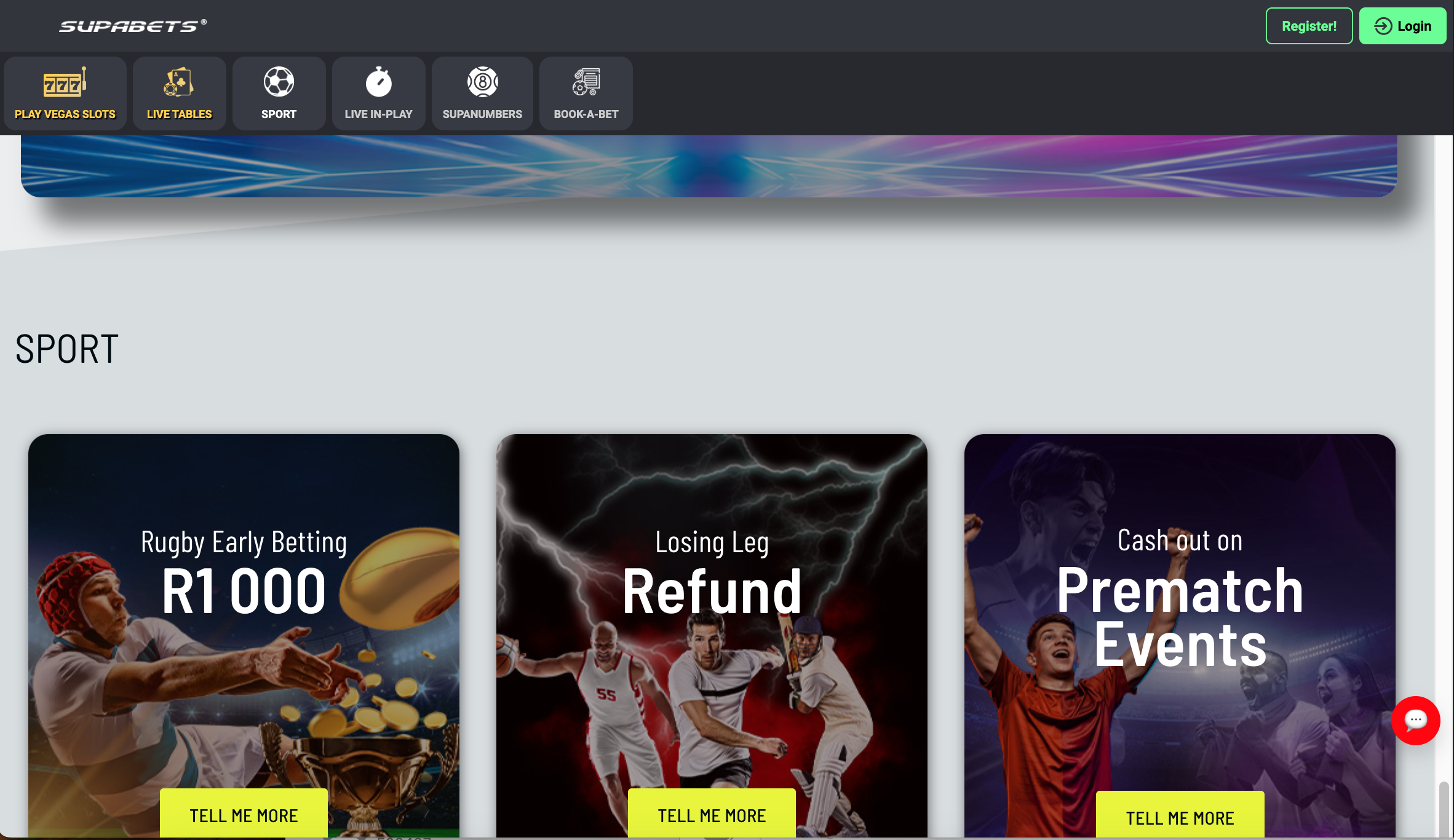 ✅ Supabets Losing Leg Refund Bonus: This is a bonus for oplayers who wager on multibets. The minimum legs requirements ins bet is 5. In the event that only one leg loses, players who participate in this bonus are eligible to receive a cashback refund on their stake. Depending on the number of events in the multibet, players can get a bonus ranging from 50% to 1000%.