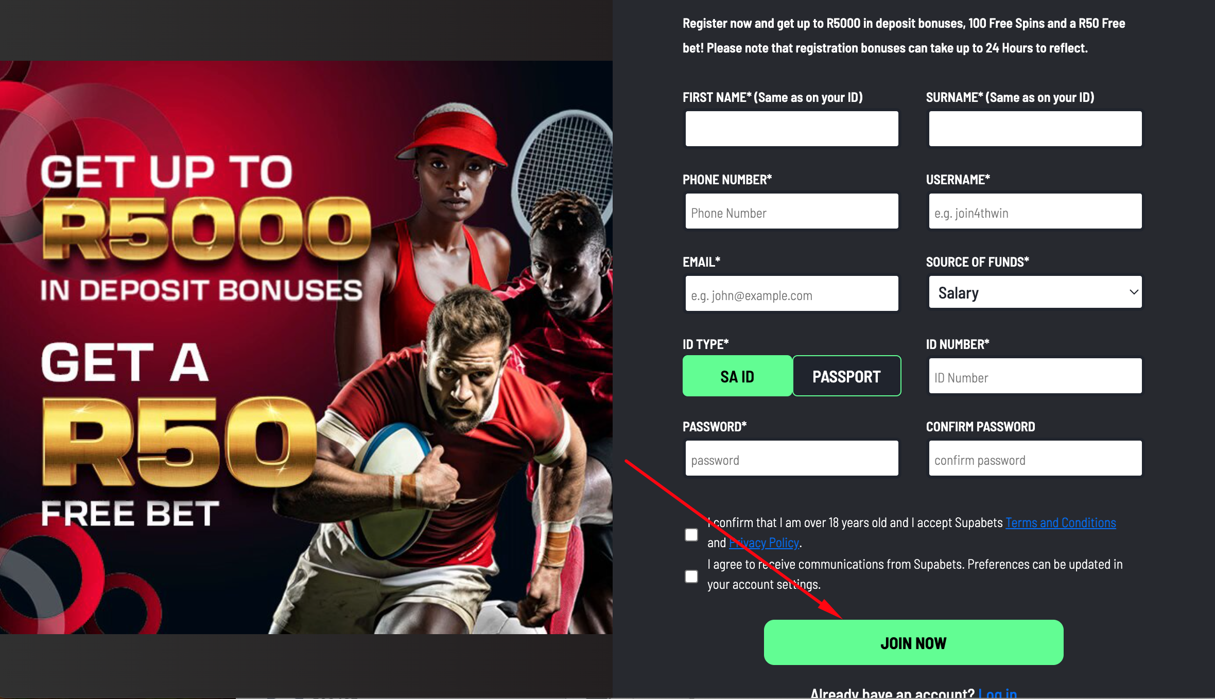 On your successful registration to Supabets, you will be offered a R50 sign up bonus. As this is a no deposit bonus, no deposit will be required to be made. Once you complete your Supabets registration, a R50 bonus will be credited to your bonus account. To withdraw this bonus, players who get the bonus should wager it 3 times at 2/1. The maximum amount you can receive from winnings of the bet placed using the R50 sign up bonus is R999.