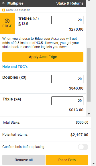 If you place a bet on the above accumulator bet with a stake of £20, it means that to have a winning outcome all the bets in the accumulator need to win.