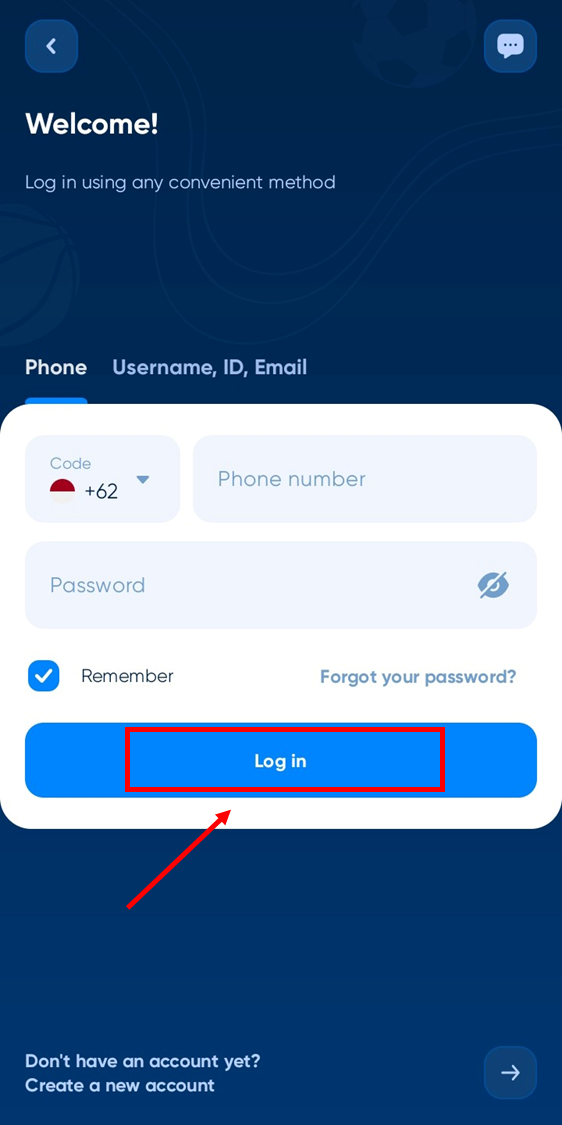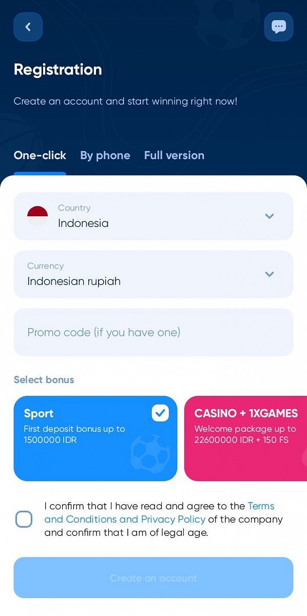 • Tap CREATE AN ACCOUNT to register on 1xBet application for Indonesia.