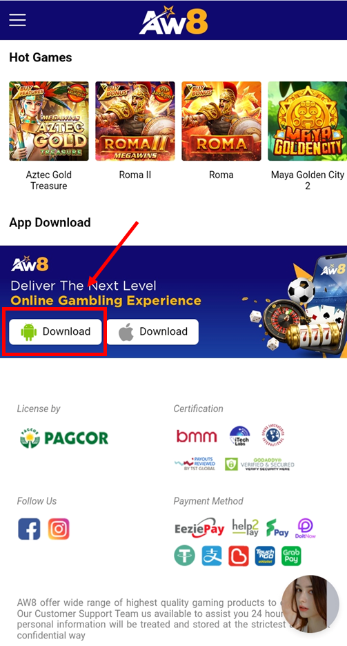 - Visit the AW8 gaming website on mobile, navigate downwards towards the end of the page and tap the DOWNLOAD button with the Android logo on it;