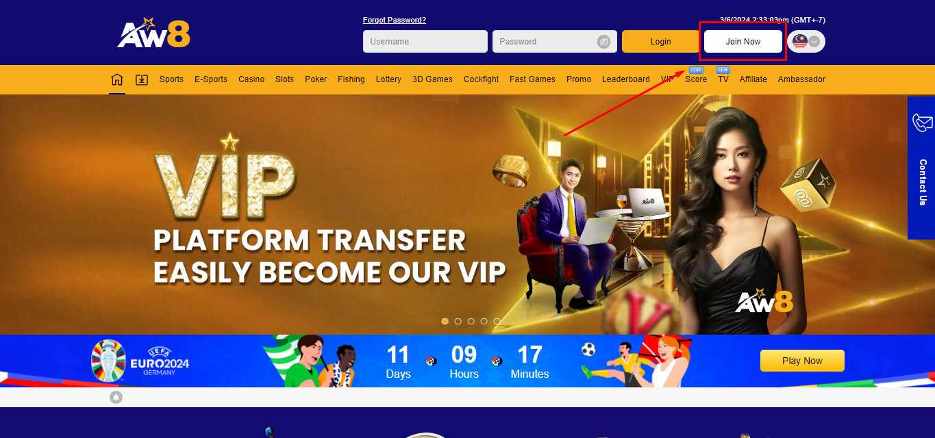 Go to the AW8 bet website and click the green JOIN NOW button.
