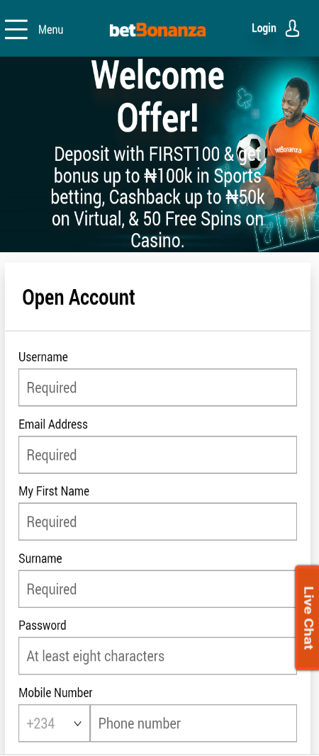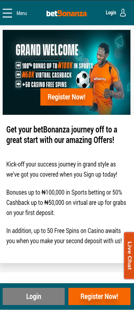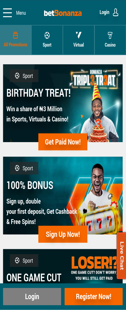 Players who visit the website are made aware of BetBonanza's sportsbook welcome bonus through an attractive animated advertisement. Your first deposit will be matched 100 percent up to $100,000 as part of the welcome offer. When making your first deposit after signing up, use the promotional code BET100 to activate this offer. It must be wagered six times with a minimum odds per selection of 1.85. The additional amount must be used on any pre-match and live games within 30 days of its activation. To receive it, enter the bonus code BET100.