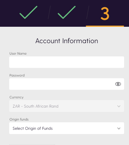 - Provide account information on these fields: Username, Password, Currency, and Select the Origin of Funds.