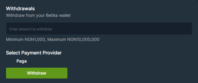 Mobile money (Mpesa) and over-the-counter methods are the only ways for payment options. For the mobile money transaction, the use of both Credit and Debit cards are very key in the depositing and withdrawing payment patterns on the Betika online sportsbook.