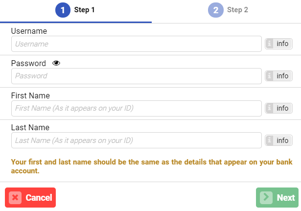 - Click the Next button and provide information for STEP 2 (password, first and last name);