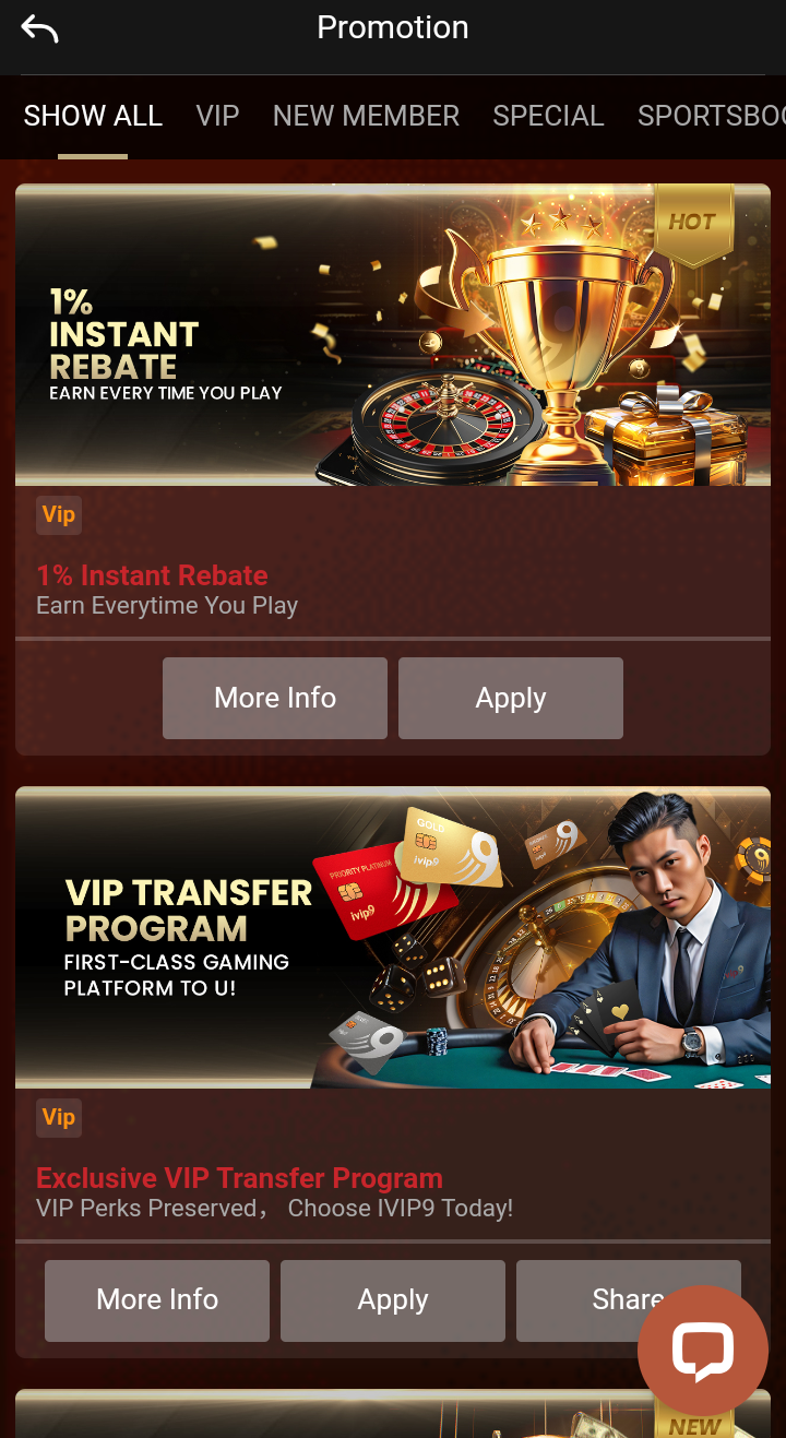 When players place a bet, they receive an instant rebate in proportion to their wager. Players have an additional benefit in the form of an instant rebate, which is a fantastic option. iVip9 does well to offer players a 1% rebate bonus as one of its alluring promotions.