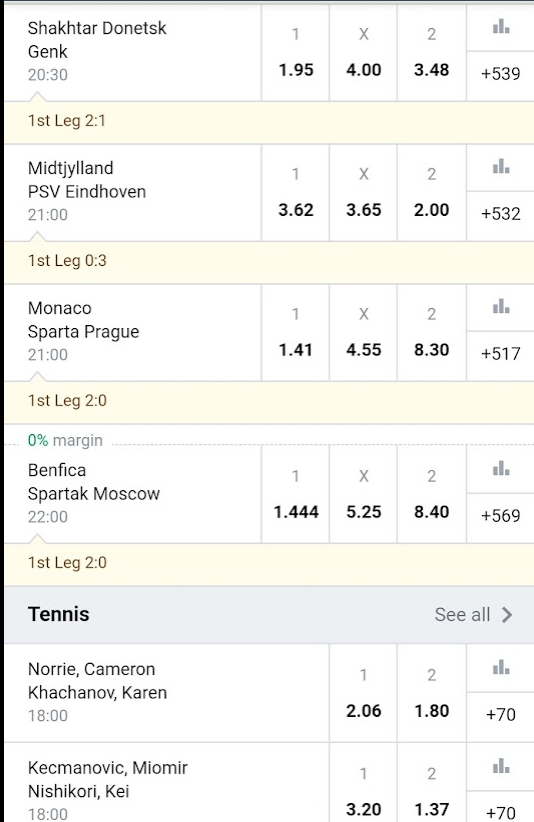 • Select matches with a 0% margin will be highlighted signifying that no commission will be taken by the sportsbook thus having the odds favoring the player.