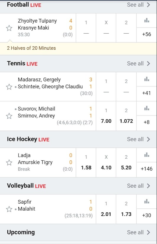 If we talk about live sports betting, then the bookmaker Marathonbet is one of the best. There are a lot of events in the live mode. It is worth noting that bets are accepted quite quickly, and if they are not already accepted, the bookmaker will notify you of this. There are also interesting statistics that show the odds and results of a particular team during live. In general, live betting can be attributed to the advantages of the bookmaker's office.