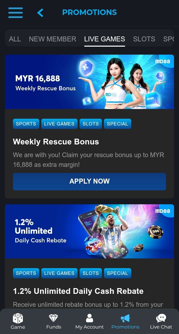 MD88 Asia offers users in Malaysia, Indonesia and Singapore a 1.2% unlimited daily cash rebate for all bets they make on MD88 online, which include sports games, slot games and MD88 live games (only Indonesia includes eSports).