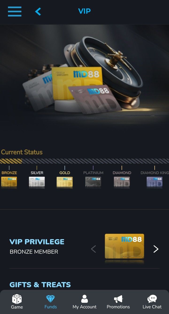 There are seven MD88 bet VIP levels, which are Bronze, Silver, Gold, Platinum, Diamond and Diamond King. The MD88 online platform grades VIP membership and status according to the level of activity on your account, specifically a minimum monthly deposit limit.