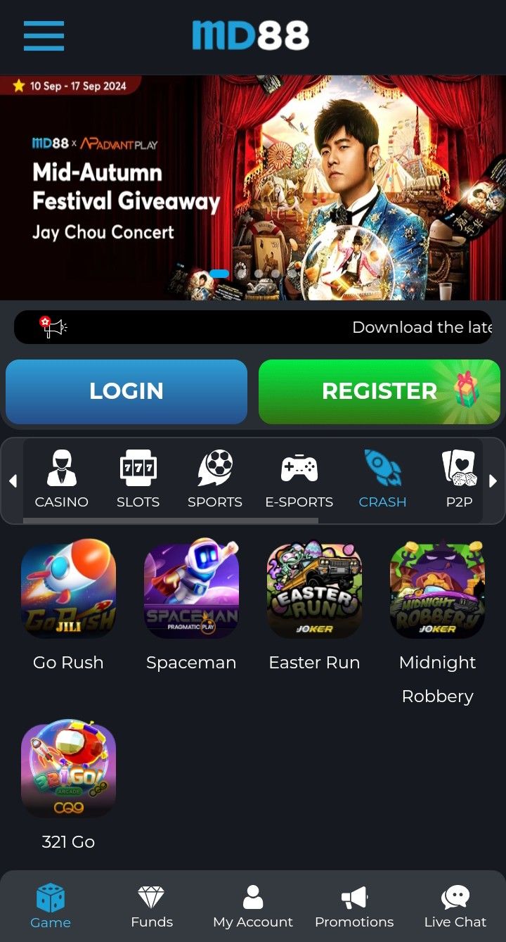 Bet and watch you multiplier increase while determining if it is a good time to cashout or hold just a bit more. This is what you get with crash games on MD88. Take a pick from games such as Go Rush, Space Man, Easter Run, Midnight Robbery and 321 go, stake, have fun, and win.