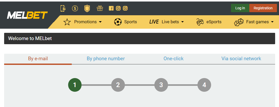 - A player will be led to the registration page, where you will be given four options for opening a Melbet account, all of which are pretty simple and require only minimal information. These options are: By One-click, By phone number, By email, and Via social network;