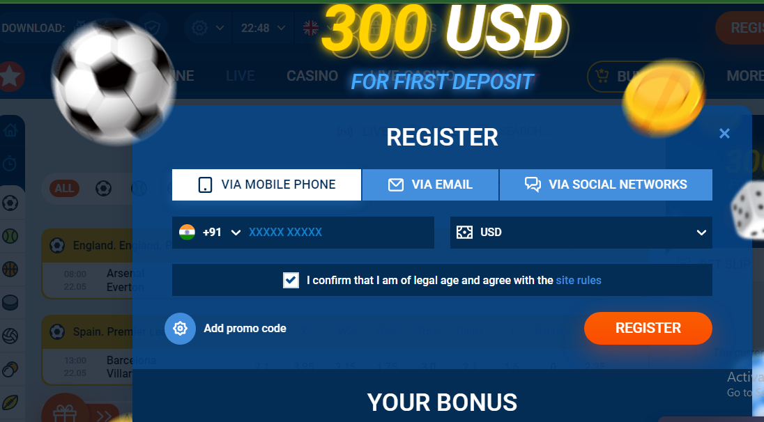 You can also sign up through social networks like Facebook, Google, Telegram, and Twitter. Enter a promo code if you have and confirm you are of legal age and agree with the site rules.