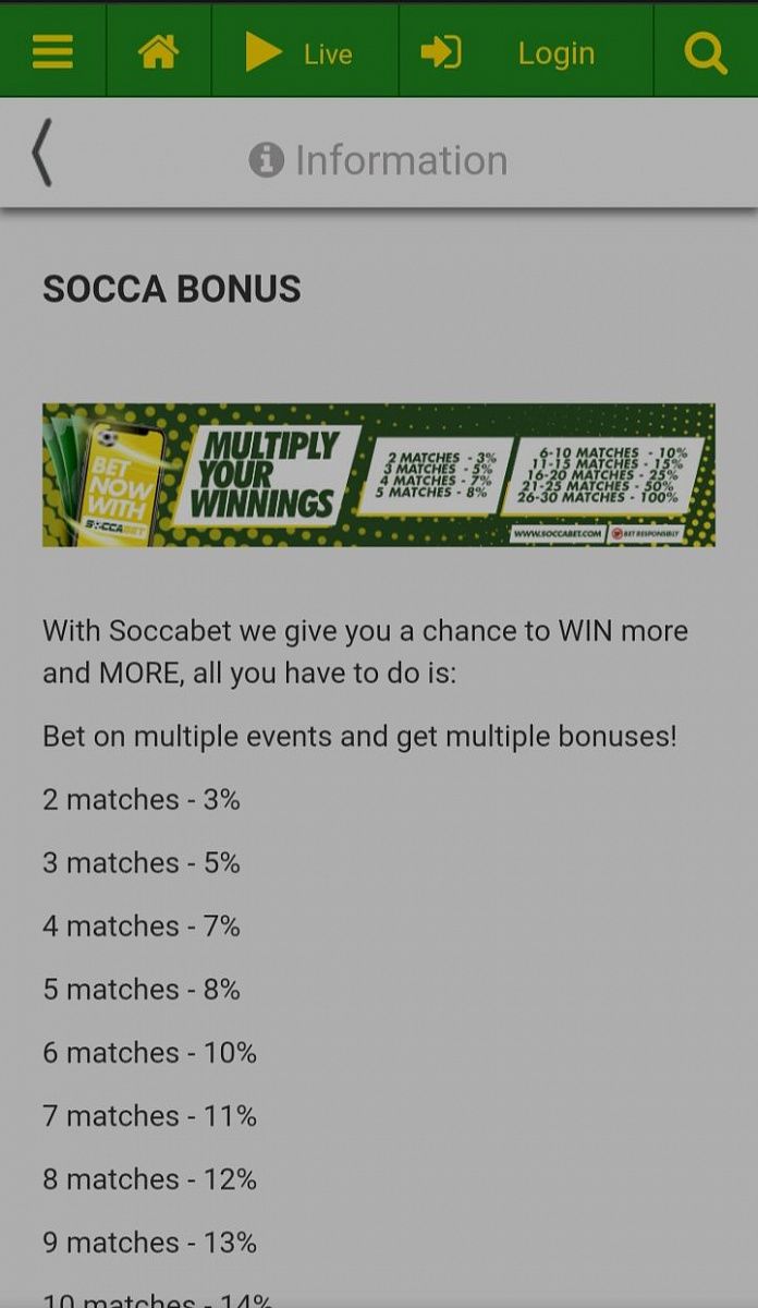 The Soccabet website is quite attractive. It does not depend on any cheap tricks to grab the player's attention and has a straightforward interface with a great layout. Animation is effectively used to display the betting site's deals and other promotions. The website is quite straightforward to use overall, with all areas and information being readily available.