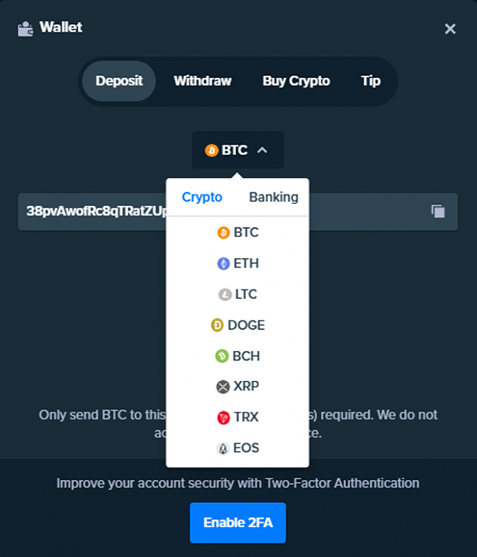 Once you log into your account, visit your profile and find a drop-down menu. Click on the wallet, and you will find deposit, withdrawal, buy crypto, and tip options.