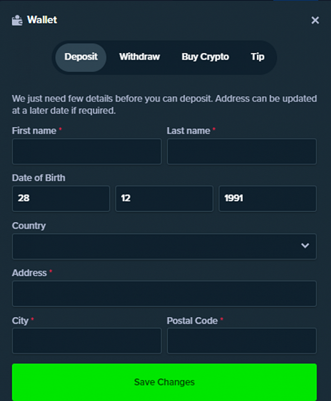 Click on the deposit option, and you will be required to provide some details before making your first deposit. You need to provide your first name, last name, date of birth, country, address, city, and postal code. After proving the details, click save changes. You can always update your address later if you need to.