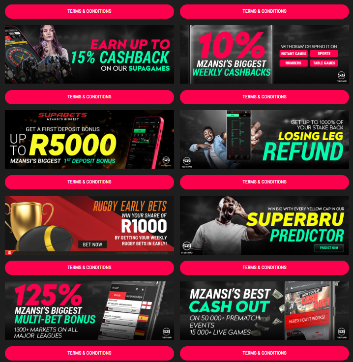 For new users, Supabets offers a selection of welcome bonuses. You can take advantage of the R50 sign-up bonus as well as the bonuses for your first, second, and third deposits. The day following registration, your account will receive the R50 signup bonus. Up to R2,000, the First investment Bonus matches 100% of your initial investment. Your second deposit earns you a 50% bonus, up to R1,000, with the second deposit incentive. In a similar vein, the third deposit incentive gives you a 100% bonus up to R2,000 on your third deposit.