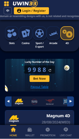 Magnum, Sports Toto 4D, Damacai, Singapore 4D, Sabah88 4D, Cash Sweep and STC 4D are some of the numerous 4D lottery games at Uwin33.