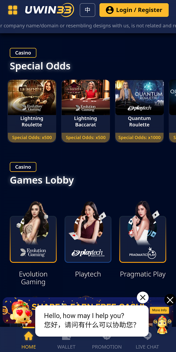 Players on the Uwin33 app stand to gain from the abundance of casino options available to them. Uwin33 users have access to a variety of live games, including Live Dragon Tiger, Sexy Baccarat, Roulette, and Live Sic Bo. Uwin33 gaming providers include some of the most reliable in the industry, including pragmatic play, Speedgaming, Gamatron, Evolution Gaming, WN Casino, Ezugi, Sa Gaming, dream gaming, Winfinity and Ho Gaming.