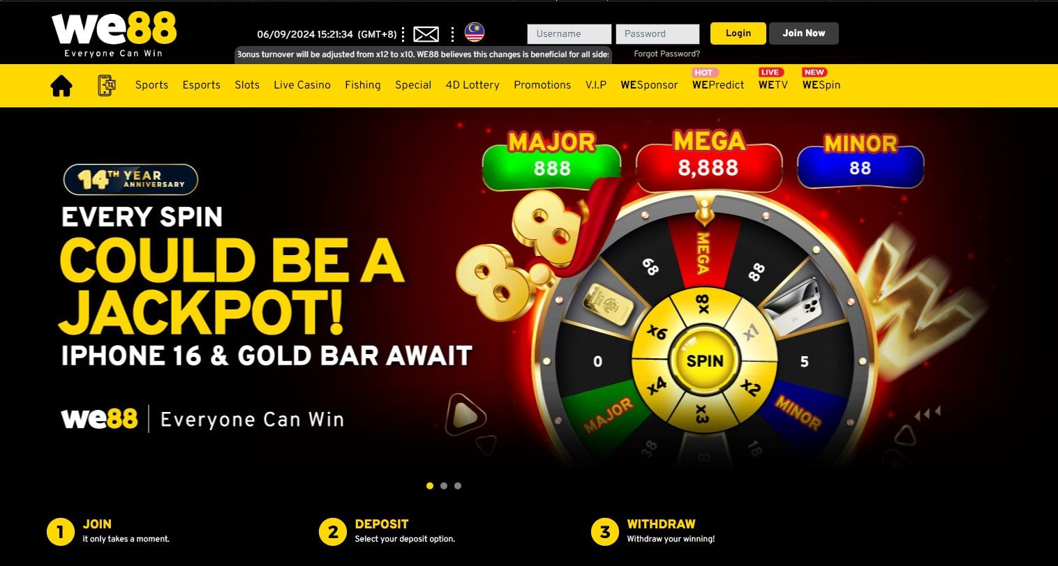 Like any other top betting sites in Malaysia, WE88 avails a variety of bonuses and promotions. New members receive 100% sports welcome bonus up to MYR 500 and 100% slot welcome bonus of up to MYR 500. More bonuses include 50% VIP monthly reload bonus, 10% unlimited reload bonus, 30% weekly reload bonus, birthday bonus up to MYR888 among others.