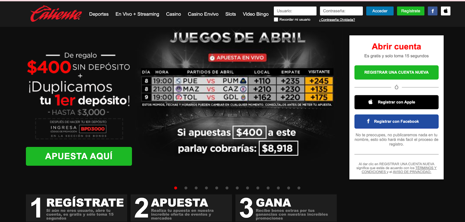 Caliente welcomes new sports bettors with a 100% up to $3000 MXN welcome bonus, in addition to the visual and registration ease. The Caliente welcome bonus is valid for seven days after registration and can be used to wager on pre match and live events. To qualify for the Caliente welcome bonus, players must use the promo code BPD3000 and make a minimum deposit of $100 MXN.
