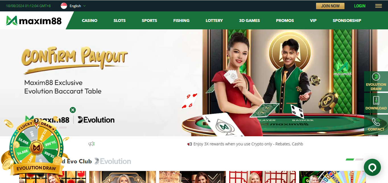 | Maxim88 | Slots and Fishing Welcome bonus, 288% up to SGD 288; All-games-in-one Welcome bonus, 100% up to SGD 500 for sports, SGD 200 for live casino and SGD 300 for slots. | Good site design; Nice bonuses | 8.7/10 |