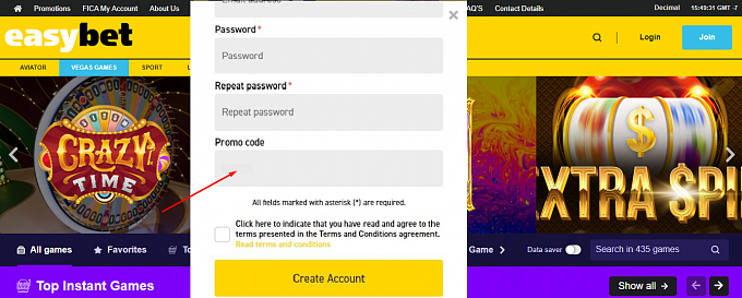 In the Promo code field, enter the TELECOMASIA Easybet sign-up promo code: "TA50" and redeem it. Do this by typing "TA50" into the field space and click or tap the CREATE ACCOUNT button at the end of the form.