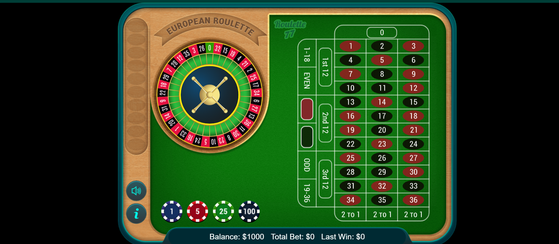 European Roulette is a classic land-based and online version. It is widely known as the simplest to play. European roulette can be found in casinos worldwide. A European roulette wheel has 37 pockets labeled from 0 through 36.