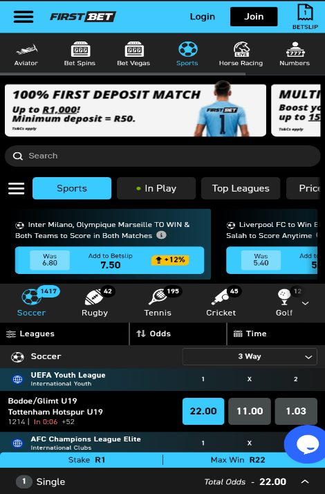 FirstBet does a pretty decent job with its odds. The sportsbook covers a wide range of sports, with soccer, rugby, and cricket being the main highlights, and the odds are usually competitive compared to other local bookies.