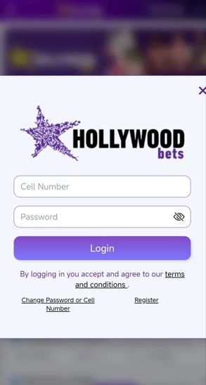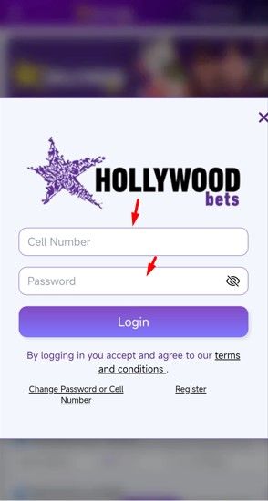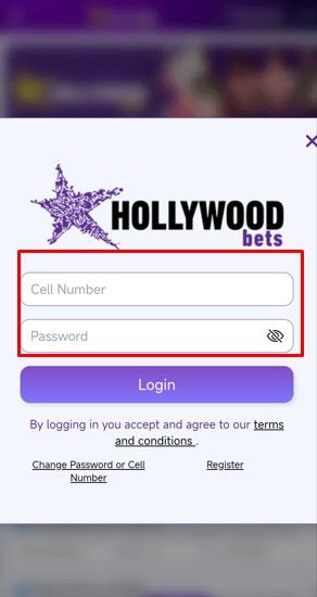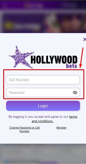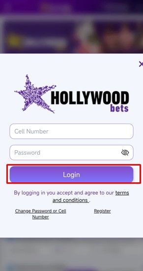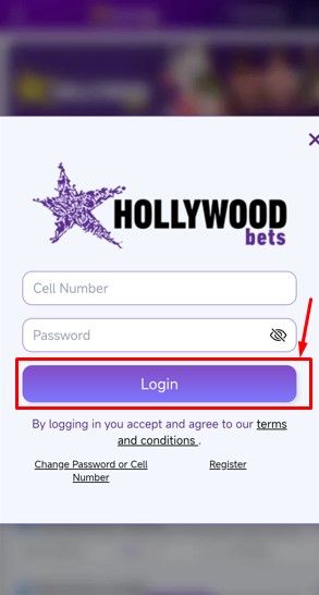 Go to the Hollywoodbets website on your phone and click the login button. Enter your cell phone and password, then click login to access your account.
