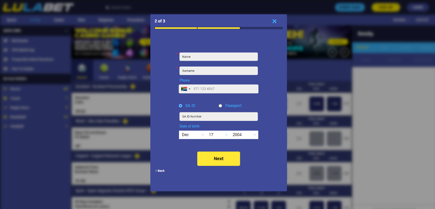 To complete the Lulabet South Africa register process, tap the Sign Up tab, which is located at the bottom of the sign up form.