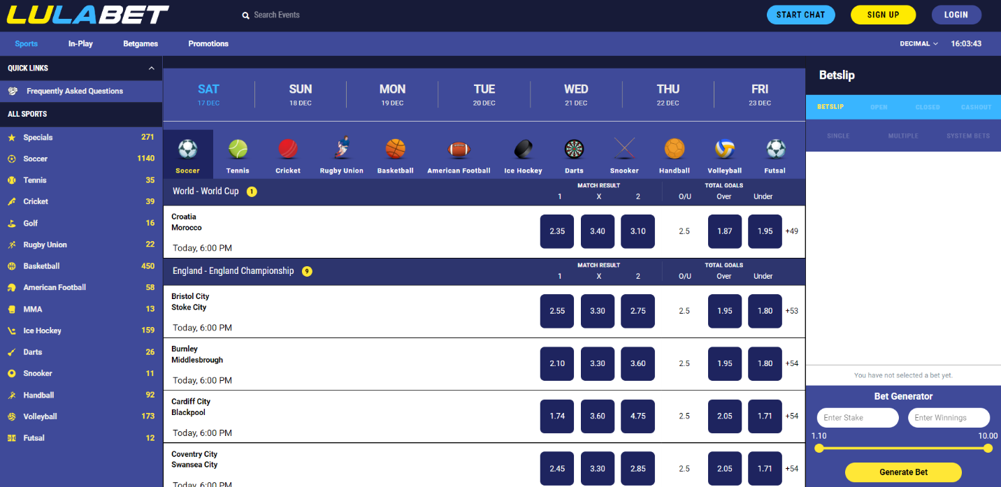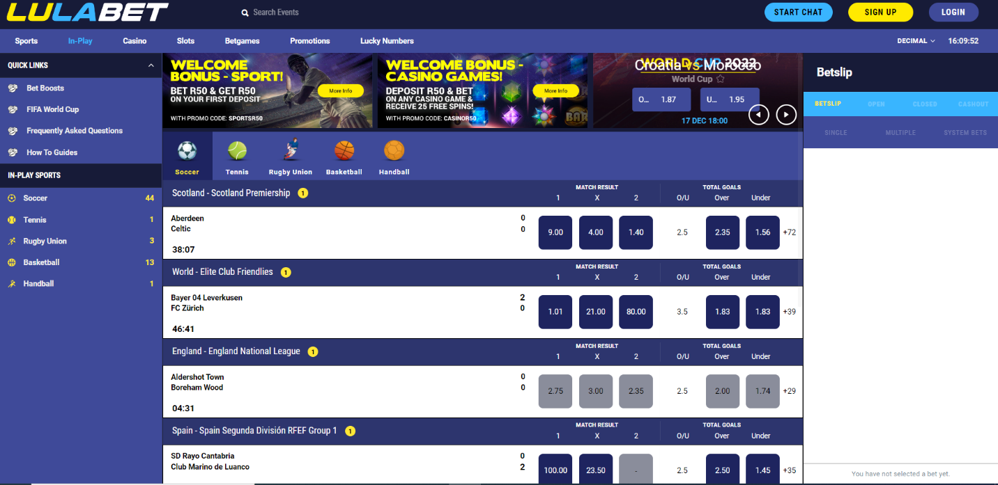 With the influx of online sports betting providers in the South Africa betting scene, players will argue which online gambling site is best in South Africa. For this, let me tell you about Lulabet. The sportsbook is one of the best betting service providers in South Africa. They offer sports and casino games, live betting, virtual betting, the aviator crash game, lucky numbers, bet generator, bet builder, and more. This bookie flaunts extensive promos such as the Multi Bets Bonus, Sports Bonus Bets, Earn Rewards For Sharing, We Make It Rain Daily etc. This Lulabet review will help as you journey through the sportsbook. Register for a Lulabet betting account and land the Sports R250 Welcome Bonus or the Sports R50 Welcome Bonus.