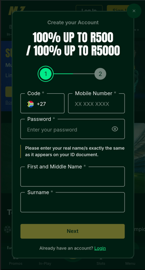 Enter your mobile number, password, first and middle name, surname, and click Next. Enter your ID/Passport, date of birth, and agree to the terms and conditions. Click Join Now to create an account.