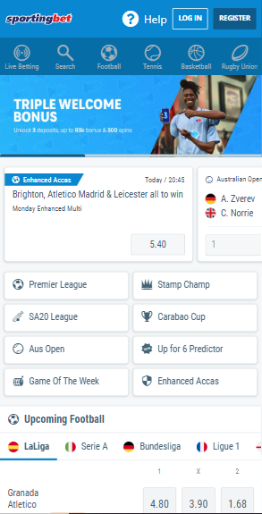 Sportingbet South Africa is a leading legal online wagering platform for punters in SA. The Sportsbook is widely known and has a reputation for exciting odds and impressive features, including a multi-generator, live betting, a blog, etc. With the mobile application, South African punters can take advantage of bonuses, which include Cashback If You Lose By One, Money Back On Losing Accas, etc. New users can use the Triple Welcome Bonus of up to R3,000 and 300 Free Spins to start their Sportingbet Sout.h Africa journey.