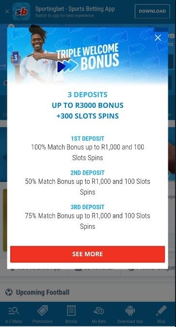 Currently, the Sportingbet app does not have a bonus available for punters who download the application for the first time. However, Sportingbet South Africa offers an impressive triple welcome bonus. The offer is available to new customers who make a minimum deposit of R5 and agree to the specific promotional terms and conditions, which will see them flex a whooping 100% deposit match up to R1,000 for their first deposit, a 50% and 75% deposit match up to R1,000 plus 300 free Slot Spins.