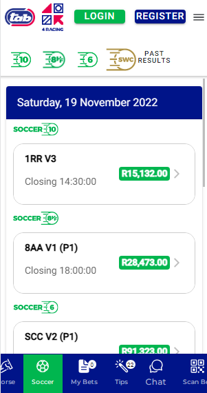 The Free-2-Play Soccer Pool is another feature that can be found on the TabOnline sportsbook. This is a free soccer daily tournament that is open to all TabOnline users. Players will be able to win up to R1,000,000 when the are successful with predicting match outcomes. They can gather points for every correct prediction and be in contention for winning prizes worth up to R10,000 to a whooping R1,000,000.irectly to your TAB account.