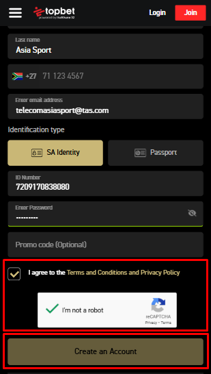 To finish the registration process on Topbet SA, please confirm your agreement to the terms and conditions and verify that you are not a robot. Then tap the Create an Account button to finish the process.