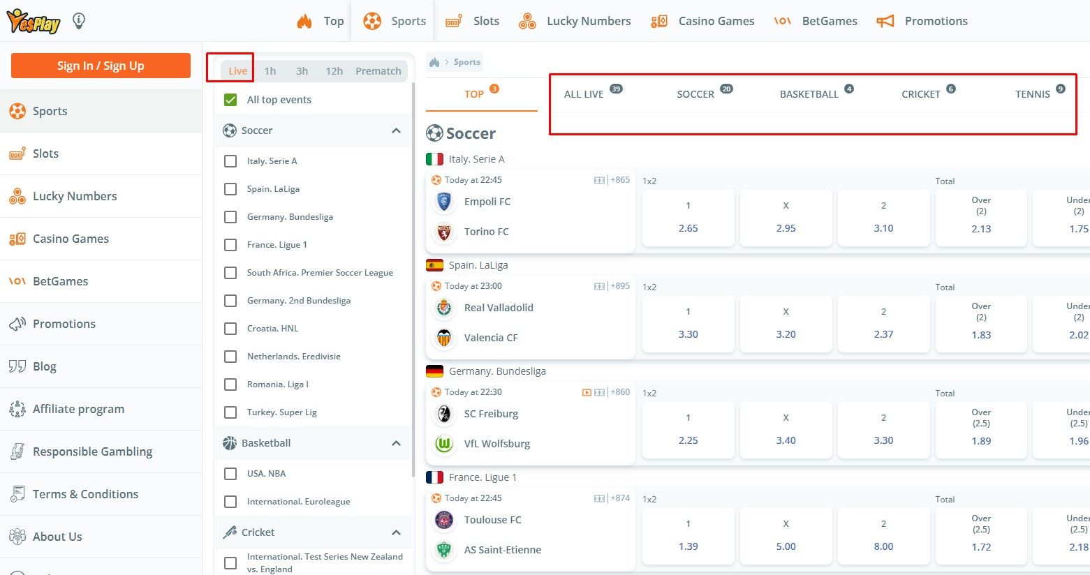 Live betting is an option you will get with Yesplay. You have to identify a game that you would bet on and go ahead to do it. It is a simple process you can do. Some of the sports you can bet live include soccer, basketball, tennis, and cricket among others.