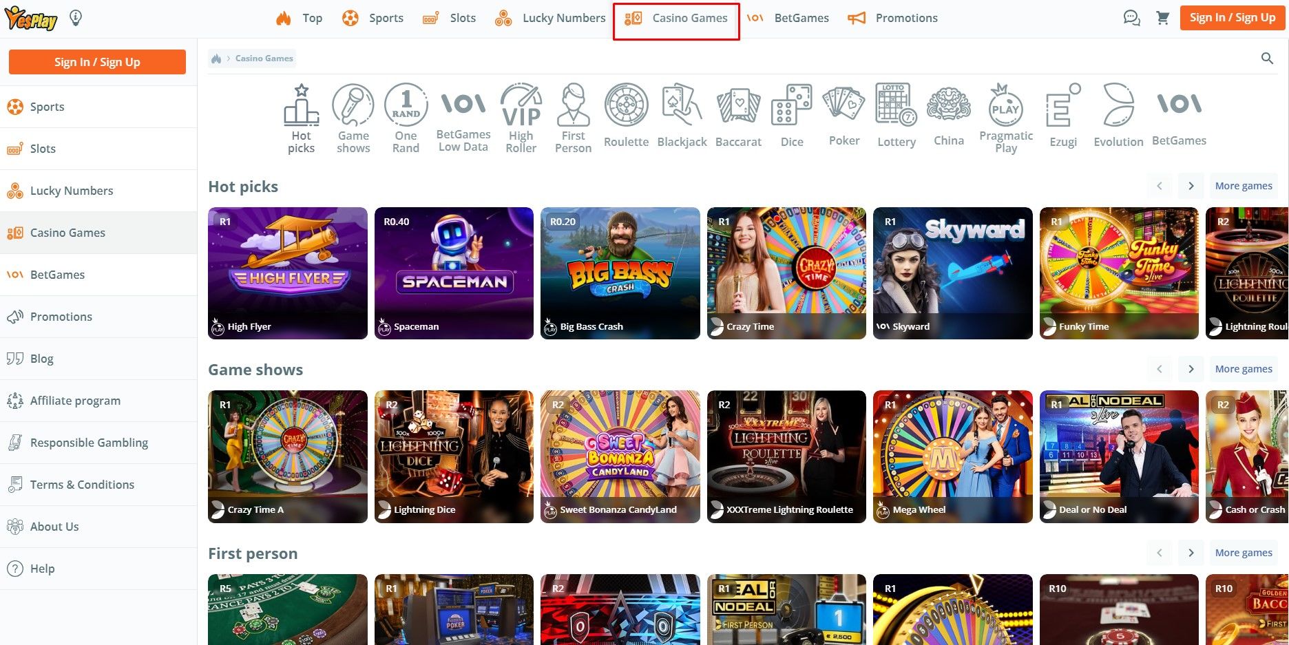 Yesplay casino online delivers over a thousand games for players to make their choices. The bookmaker is now offering a variety of Yesplay-branded slots and casino games. Some of their branded games include Hot Hot Fruit, Yesplay Starburst, and Skyward. These games offer exclusive features and local themes that resonate with South African players. Additionally, there are lucky numbers, slots, card games, etc. Let's use this categorization of featured games, slots, poker, table games, lotteries, live games, and other games.