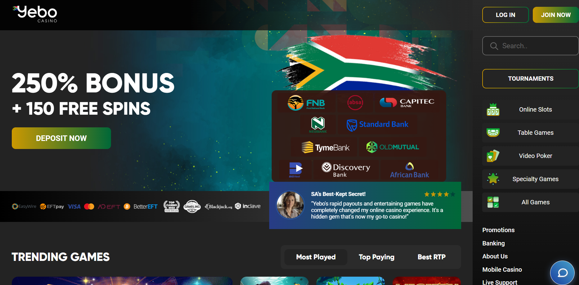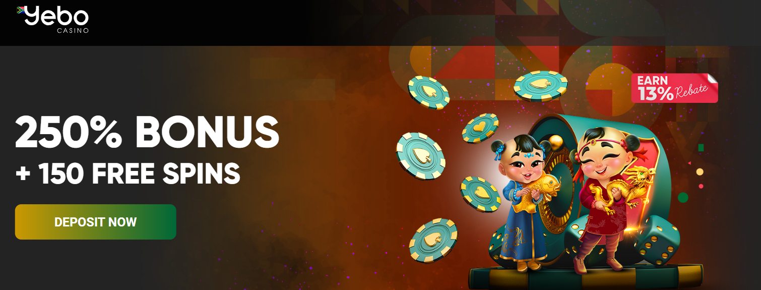 Yebo Casino a high-value 250% Welcome Bonus plus 150 Free Spins, mobile gaming applications, and safe payment methods.